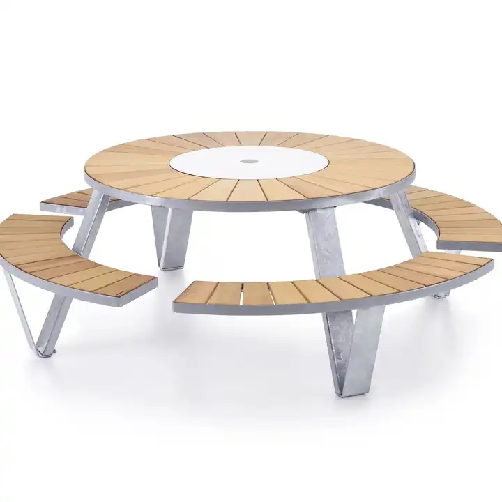 Izturīgs metāla rāmis koka virsma apaļa galda ar piestiprinātiem krēsliem moderns dizains āra iekštelpu terases mēbeles