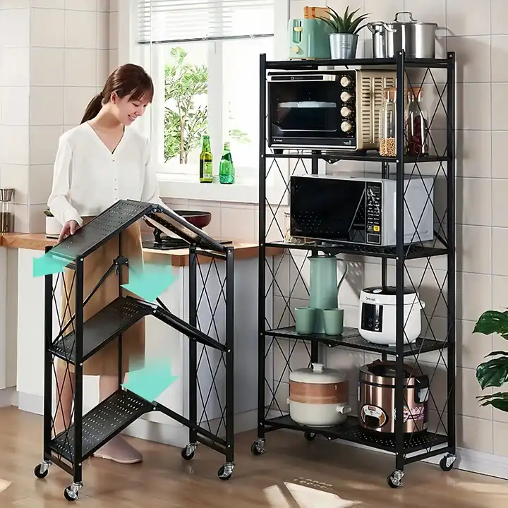 Metāla rāmis 5-slāņu saliekams uzglabāšanas turētājs mūsdienīga virtuves uzglabāšanas plaukts virtuvei un noliktavai ar slēdzeni