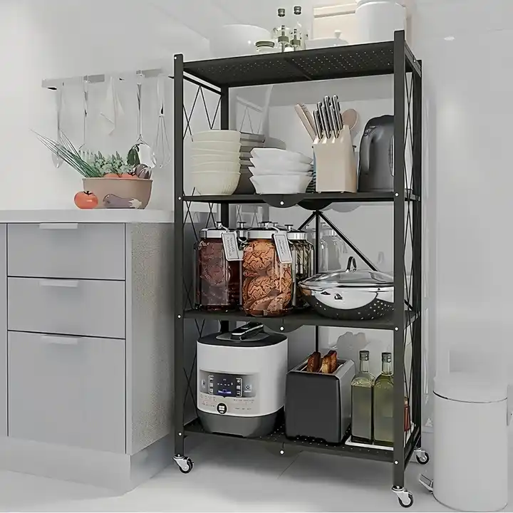 Mūsdienīgs 5 slāņu salokāms metāla rāmja virtuves plaukts ar riteņiem vietas taupīšanas glabāšanai un atslēgu slēdzeni, stāvošais tips