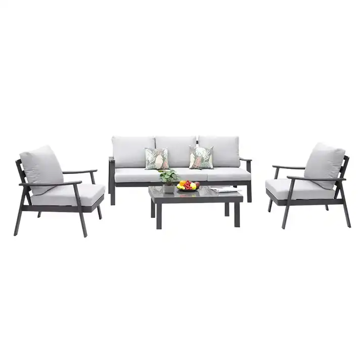 Mūsdienīgs stūra dīvāna komplekts mājas dzīvojamai istabai, jaunais dizains, 4-daļīgs metāla rāmja mēbeļu komplekts iekštelpām un āra apstākļiem