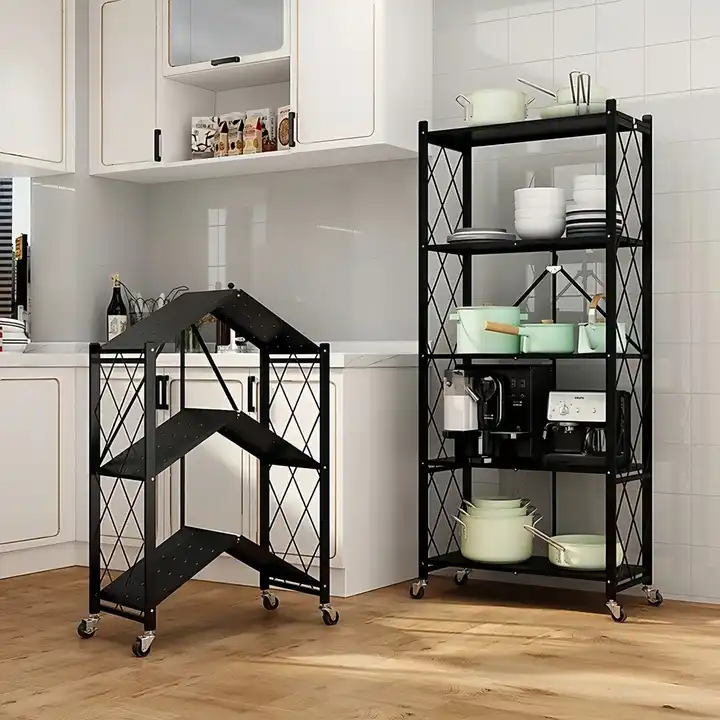 Mūsdienīgs virtuves metāla rāmja 5-slāņu saliekams uzglabāšanas plaukts ar atslēgu slēdzeni, vietas taupīšanai virtuvē vai noliktavā