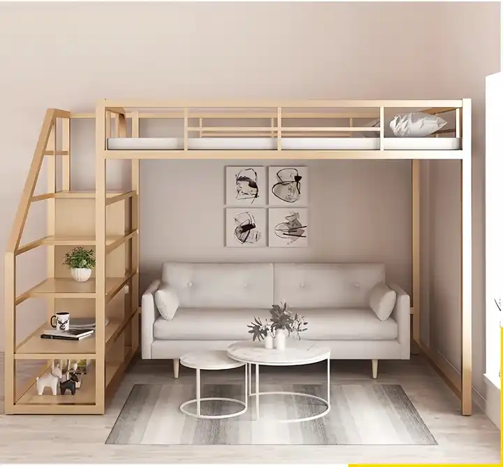 Telpas taupošs grezns dizains iekštelpu mājas mēbeles kāpņu divstāvu gulta guļamistabas mēbeles metāla rāmja gulta ar rezerves vietu dīvānam