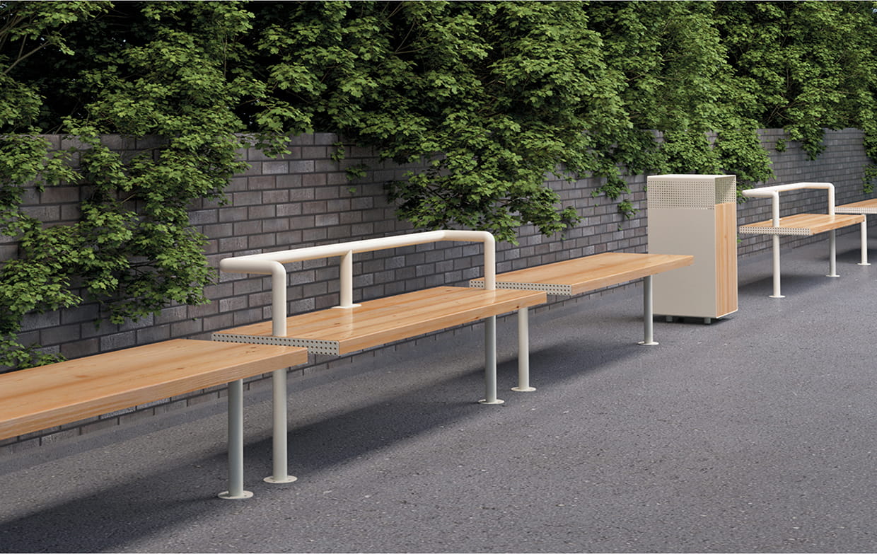 The robust base of this bench is made from high-quality, powder-coated steel, promising unwavering stability and superior weather resistance. This bench is built to withstand the elements and the test of time. The seating area, constructed from premium larch wood, offers unparalleled comfort, inviting weary urban explorers to pause and take a moment of respite in the fresh air.